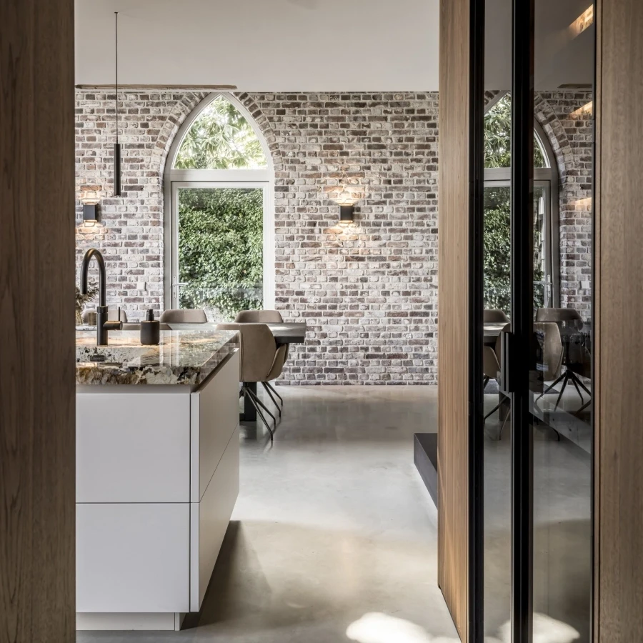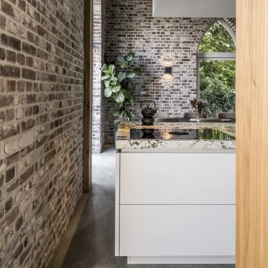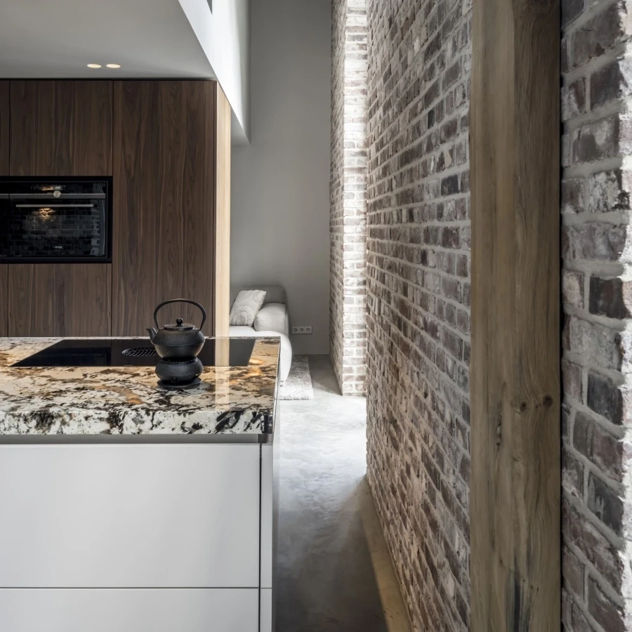 De combinatie van natuursteen en maatwerk notenhout komt maximaal tot zijn recht door zorgvuldig geïntegreerde verlichting. Het licht accentueert het blad, versterkt de warme houttinten en geeft de ruimte extra diepte. Zo ontstaat een stijlvolle balans tussen oud en nieuw, met een modern interieur vol karakter.