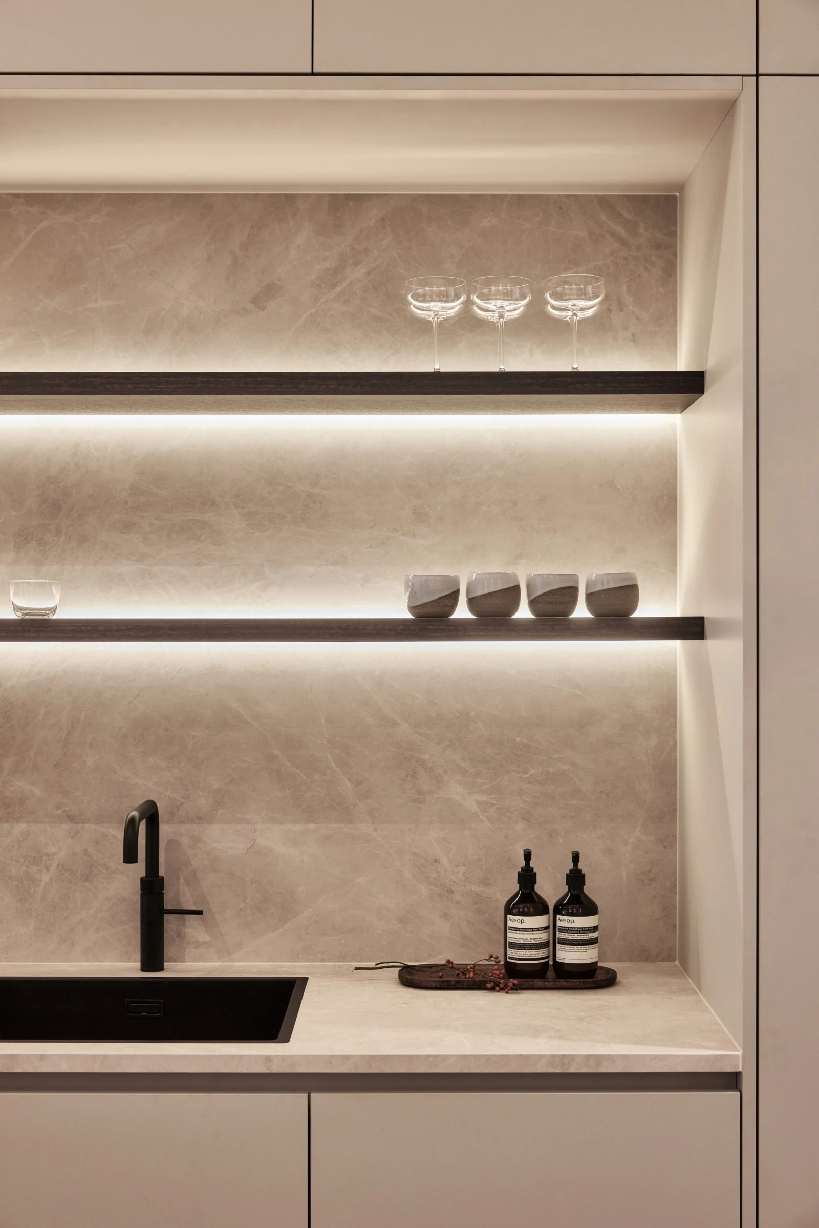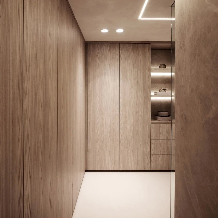 Deze prachtige woning combineert verfijnde elegantie met een tijdloze uitstraling. Natuurlijke tinten, warme bronstinten en maatwerkmeubilair vormen een harmonieus geheel, waarbij de verlichting zorgt voor sfeer, diepte en een luxueuze beleving. Het hart van de woning is de maatwerkkeuken met een indrukwekkend keramieken eiland als centraal statement. Dankzij subtiele accentverlichting en zorgvuldig geplaatste LED-verlichting komt de textuur van het keramiek extra tot leven en krijgt de ruimte een warme, uitnodigende gloed. Zo versterkt het licht niet alleen het ontwerp, maar tilt het de volledige woonbeleving naar een hoger niveau.