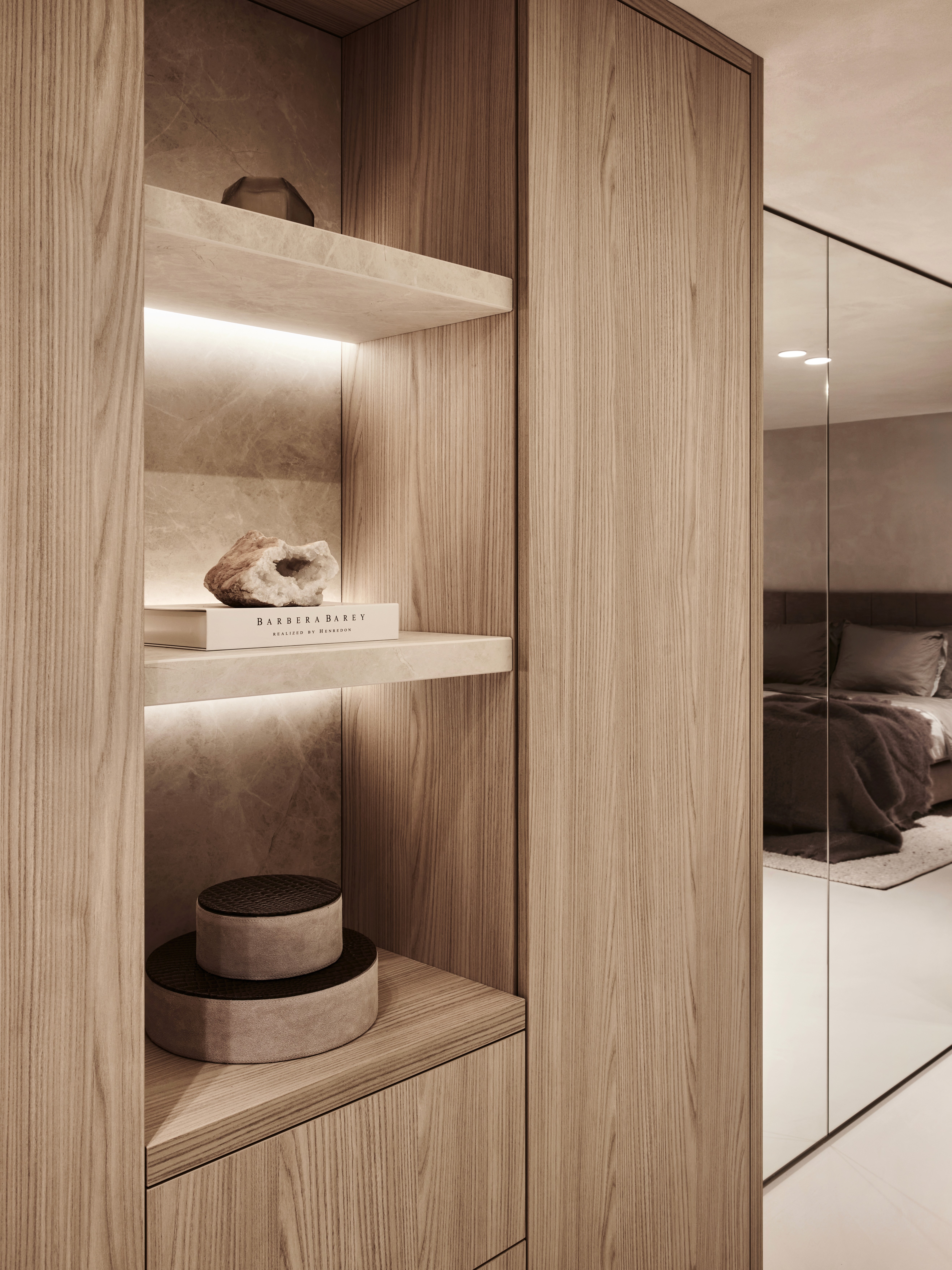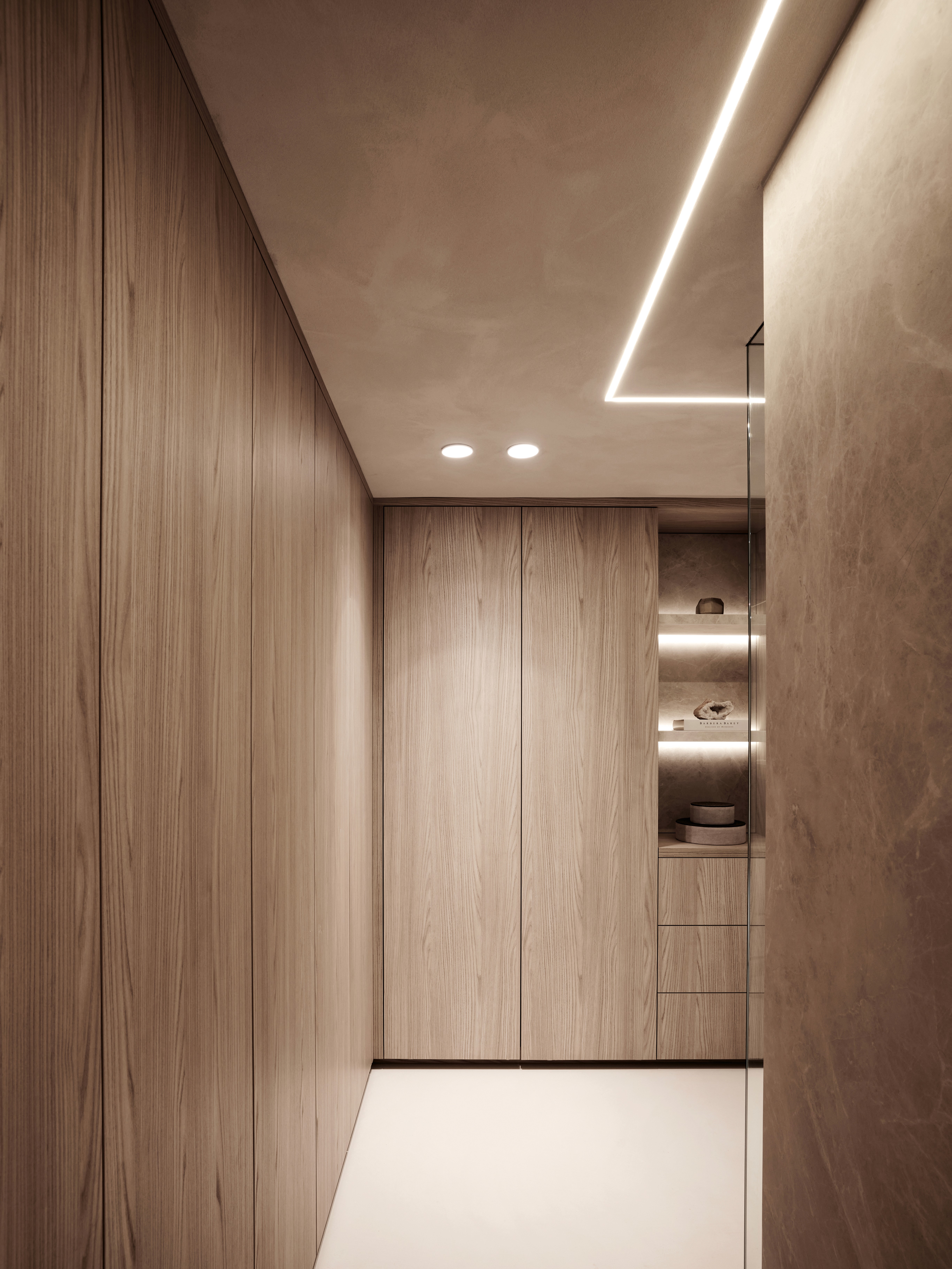 Deze prachtige woning combineert verfijnde elegantie met een tijdloze uitstraling. Natuurlijke tinten, warme bronstinten en maatwerkmeubilair vormen een harmonieus geheel, waarbij de verlichting zorgt voor sfeer, diepte en een luxueuze beleving. Het hart van de woning is de maatwerkkeuken met een indrukwekkend keramieken eiland als centraal statement. Dankzij subtiele accentverlichting en zorgvuldig geplaatste LED-verlichting komt de textuur van het keramiek extra tot leven en krijgt de ruimte een warme, uitnodigende gloed. Zo versterkt het licht niet alleen het ontwerp, maar tilt het de volledige woonbeleving naar een hoger niveau.